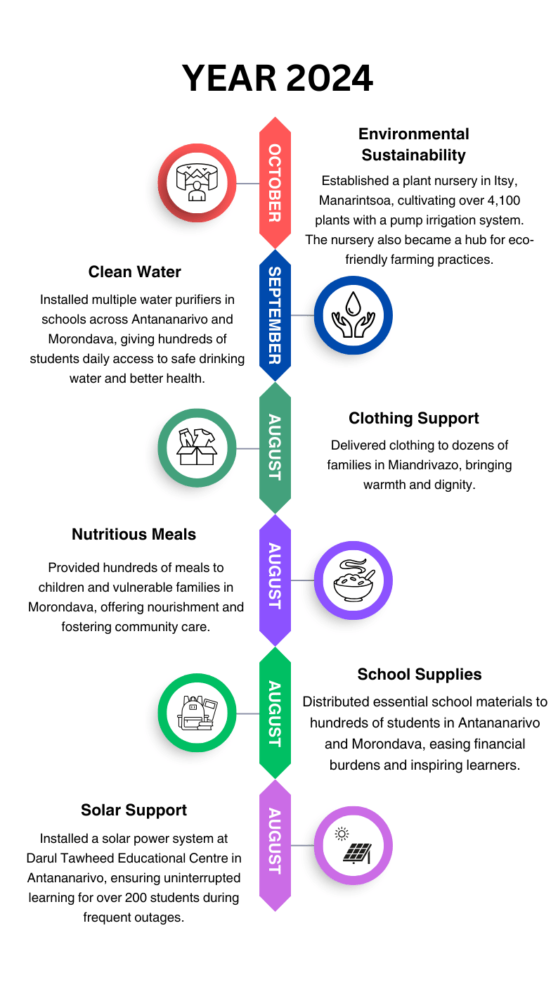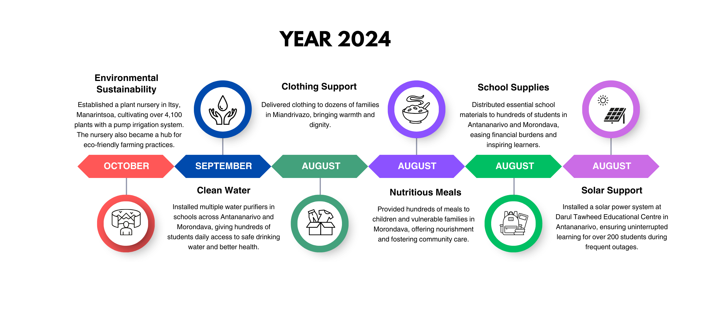 In August 2024, a solar power system was installed at Darul Tawheed’s educational centre in Antananarivo to ensure uninterrupted learning despite frequent power outages.